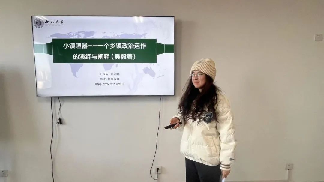 2023级社会保障专业硕士研究生杨巧雲分享的书籍是《小镇喧嚣——一个乡镇政治运作的演绎和阐释》。汇报从作者介绍、书籍主要内容、核心议题以及乡村治理的现实困境与启示四个部分展开。她首先介绍了这本书是长期专注中国农村政治研究的华中科技大学教授吴毅于2003年3月到2004年底前往华中地区某乡镇,进行了为期一年半的田野研究并记录而成的。接下来,汇报重点讨论了《小镇喧嚣》中的“国家一社会”理论视角,分析了基层政权、村级组织与农民在复杂互动结构中的博弈与共生。杨巧雲通过思维导图,进一步阐述了书中揭示的乡镇治理的复杂逻辑,尤其是基层政府、村级组织与农民三方之间的权力博弈。她特别提到,乡镇治理中的权力传导呈现出“上面千条线,下面一根针”的格局。基层政府不仅负责行政职能,还肩负经济运营压力和政治任务;而村级组织作为中介,既要执行政府任务,又要代表村民利益,双重身份使其在治理中充满妥协与矛盾。此外,杨巧雲还深入剖析了“弱政—刁民”模式,指出基层政府在治理困难时,往往依赖柔性手段和非正式技术来推动工作。农民通过示弱和“行蛮”策略与政府展开博弈,村级组织则通过点发、人情关系和调解等手段,平衡各方利益,展现了乡村治理中的情境化特征。最后,杨巧雲总结道,尽管《小镇喧嚣》描绘的是20多年前的乡镇治理情况,但其中所讨论的治理问题依然具有现实意义。特别是政府、村级组织与农民之间的博弈关系,依然是理解和推动乡村治理转型的重要切入点。