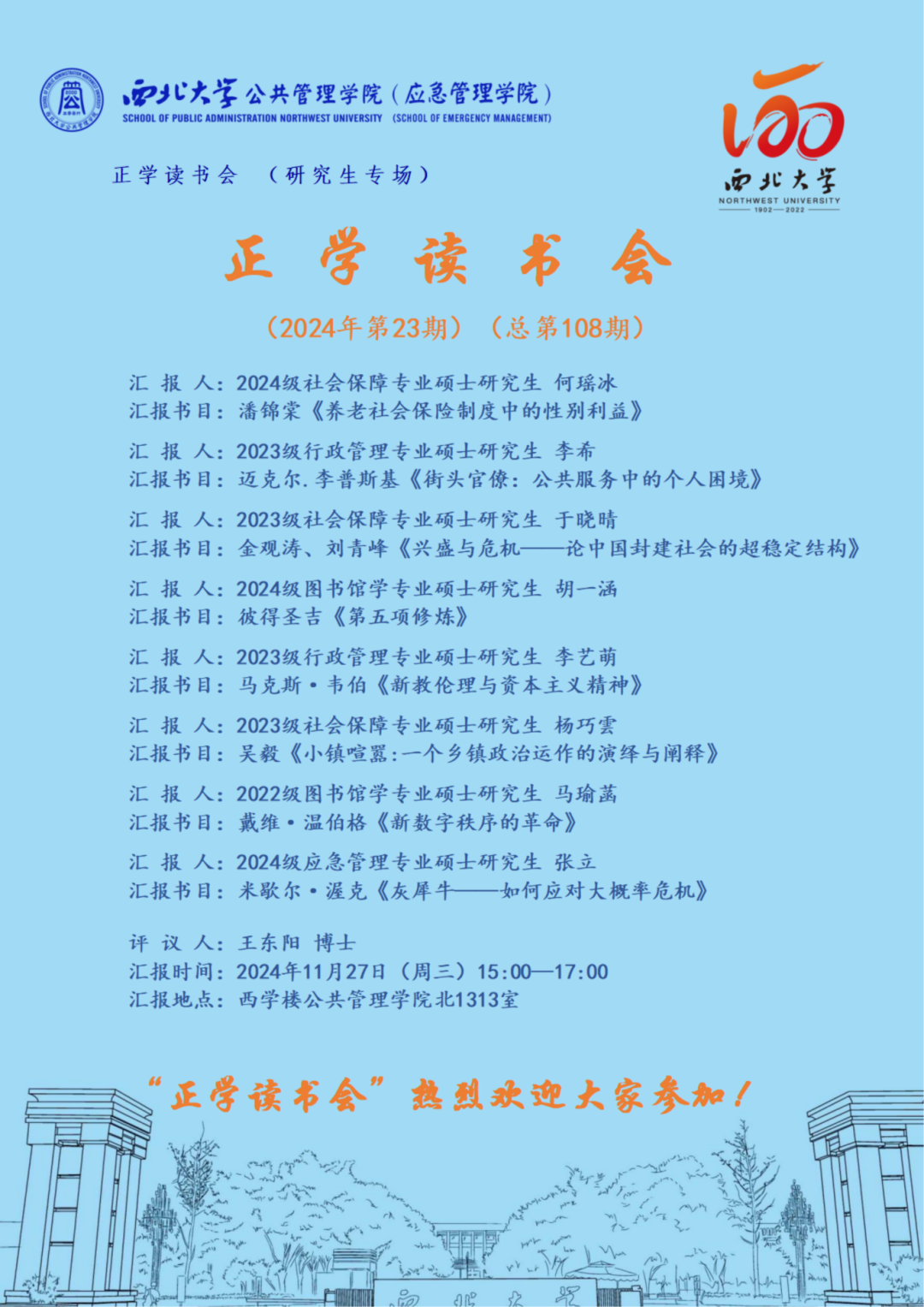 2024年11月27日,我院在西学楼北1313举办了2024年第23期正学读书会。西北大学565net必赢2024级社会保障专业硕士研究生何瑶冰、2023级行政管理专业硕士研究生李希、2023级社会保障专业硕士研究生于晓晴、2024级图书馆学专业硕士研究生胡一涵、2023级行政管理专业硕士研究生李艺萌、2023级社会保障专业硕士研究生杨巧雲、2022级图书馆学专业硕士研究生马瑜菡、2024级应急管理专业硕士研究生张立分别作为主讲人进行读书汇报,565net必赢2022级博士研究生王东阳担任评议人,部分研究生旁听了此次报告会。