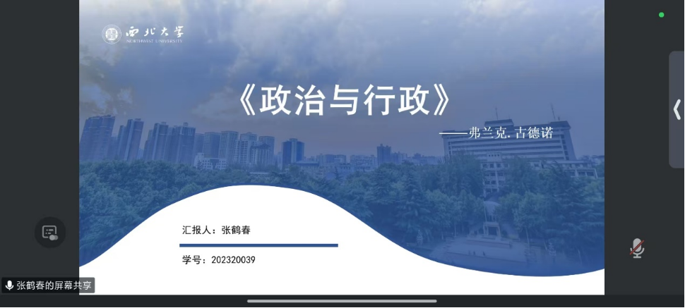 2023级行政管理专业硕士研究生张鹤春分享的书籍是弗兰克·古德诺《政治与行政》,她围绕本书简介、创作背景、内容梳理及思考与启示四个方面展开。首先,她对作者和本书内容进行了简单的介绍。此书围绕政治行政二分的核心议题,对其进行全面系统的阐述,立足对美国当时的政治现状和政府的活动的深层考察与分析,凝练出政府体制改革的有效机制。其次,在对书籍创作背景了解的基础之上,她对内容进行了梳理。古德诺突破传统三权分立框架,将政府功能简化为“政治”与“行政”,即国家意志的表达和国家意志的执行,强调二者需协调统一。在走向协调的道路上作者提出两大路径:政治对行政的适度控制确保民主合法性,行政权适度集权化提升执行效率,并指出政党是调和矛盾的关键纽带。最后,她在对本书的内容进行思考后发现,古德诺理论的核心对于新时代中国国家治理依然具有极为重要的指导作用。