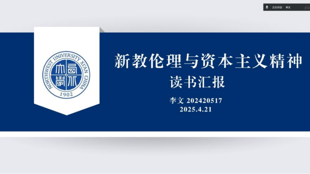 2024级政管理专业硕士研究生李文分享的书籍是德国社会学家马克斯·韦伯的经典著作《新教伦理与资本主义精神》,她从整体内容梳理、思考阐发和案例分析三个部分深入探讨了书中核心观点及其对现代社会的启示。首先她指出,韦伯在书中提出了“欧洲近代资本主义产生与发展的原因”这一核心问题,并从东西方文化对比入手,将论证聚焦于“理性精神”。韦伯认为,这种理性精神的形成源于宗教的力量,特别是新教信仰的伦理义务观念。书中指出,宗教改革是资本主义精神萌发的关键节点,路德的天职观和新教的入世禁欲主义共同塑造了资本主义精神。这种精神促使教徒将世俗活动视为荣耀上帝的方式,通过职业劳动积累资本,推动了资本主义的发展。在思考部分,李文同学深入探讨了物质与精神的关系。韦伯认为,资本主义精神并非源于经济基础的压迫或剥削,而是一种基于宗教信仰的苦行精神。这种精神体现为兢兢业业、勤勤恳恳的生活态度,与中国传统美德有相似之处。韦伯进一步指出,资本主义精神会转化为“天职”观念,这种观念带有强烈的宗教背景,强调赚钱是一种苦行,反对非理性消费。李文同学通过这一分析,提出了对现代社会的反思,同时结合现代社会中的“打工人”现象,探讨了职业精神的空心化问题。她认为,韦伯所提出的“天职”观念天然带有伦理含义,体现了一种对职业的特殊态度,是职业精神的重要来源,如今人们在职业选择和发展上,越来越注重个人核心价值、意义感、目标感和社会贡献性,而不仅仅是经济奖励或职位提升。最后她引用了韦伯在《以学术为业》中的话,强调将职业视为目的本身,不断锻造核心职业能力,并在其中寻求自我价值认同和社会贡献。
