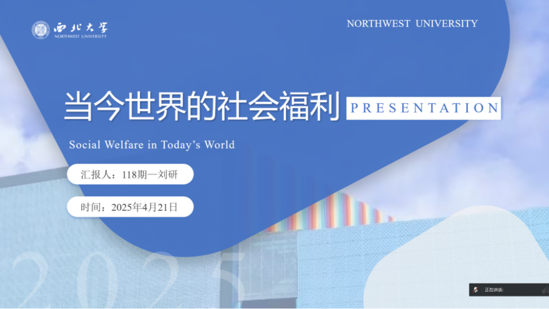 2024级社会保障专业硕士研究生刘研分享的书籍是怀特科和费德里科的《当今世界的社会福利》,她从书籍介绍、核心内容梳理和启发与反思三个部分展开。介绍了两位作者对社会福利、“归咎于受害者”和制度性歧视三个核心概念的定义,分享了美国社会福利的五大支柱,分析了其在保障民众生活、减少贫困等方面的积极作用,同时也揭示了存在的一些问题,如财政压力、福利依赖等。在启示部分强调了社会福利在促进社会公平、维护社会稳定、增强社会凝聚力等方面的重要价值。