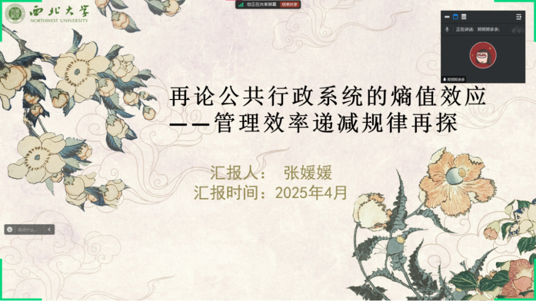 2024级行政管理专业硕士研究生张媛媛分享的书籍是齐明山教授的《再论公共行政系统的熵值效应——管理效率递减规律再探》,从作者简介、概念介绍、研究内容与问题、研究思路与框架、总结与思考五个部分展开分享。首先介绍了官僚制和熵、熵增定律的概念和内涵,指出,官僚制是政府的组织结构,是公共行政系统以效率为中心而进行的一种组织设计,熵增定律是指事物结构的必然衰退的规律,还介绍了作者从封闭系统的共性和系统中要素互动下必然产生的低效率两个各方面,用熵定律分析行政系统运行的理论契合性。其次介绍了本文的研究问题,作者主要围绕官僚体制制度性失效的表现、成因,宪政制度的本质以及与制度性失效的联系,庸人政治的形成、危害及应对之举三大方面形成论文的基本结构。关于“庸人政治”的形成原因,作者从四个方面进行剖析,包括官僚制排他性的政治现实、加强政府的合法性的制度本质、层层分工的“能量递减”、官僚制的“自由企业”的形成四个部分。庸人治政会导致公共行政系统效率低下,表现为负熵值减少,正熵值增加,作者指出要改变这种现象就必须进行一系列的改革,而且要不断地进行改革才能保持组织的高能量、高效率。