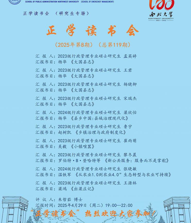 2025年4月29日,我院在线上举办了2025年第8期正学读书会。西北大学565net必赢2023级行政管理专业硕士研究生孟英婷、王君、杨晓柳、宋瑞杰、鲁宇、崔雨萌、黎冬晨、王源林,2024级行政管理专业硕士研究生张晓敏、梁欣怡分别作为主讲人进行读书汇报,565net必赢2024级博士研究生朱哲茹担任评议人,部分研究生旁听了此次报告会。