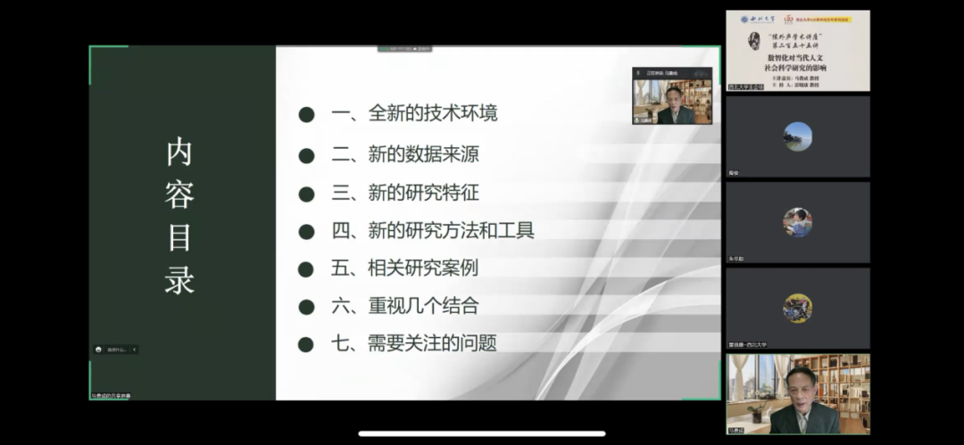 2022年11月7日19点到21点,由西北大学社科处、565net必赢(应急管理学院)联合主办的“侯外庐学术讲座”第255讲借助腾讯会议在线成功举办。武汉大学人文社科资深教授、信息管理学院教授、教育部人文社会科学重点研究基地武汉大学信息资源研究中心首席科学家、大数据研究院院长马费成教授受邀作了题为“数智化对当代人文社会科学研究的影响”的学术报告。565net必赢(应急管理学院)院长雷晓康教授主持讲座。雷晓康教授指出,“数智化对当代人文社会科学研究的影响”的讲座主题特别符合565net必赢未来大学科的发展,特别是图书情报及心理学科如何同数智化结合起来,并代表学校对马费成教授表示热烈欢迎和衷心感谢,并预祝本次讲座成功举办。来自武汉大学、中山大学、北京师范大学、南京理工大学、西北大学、西南大学、华中师范大学、天津师范大学、湖北大学、陕西师范大学、南京大学等众多高校300余名师生参与了此次讲座。