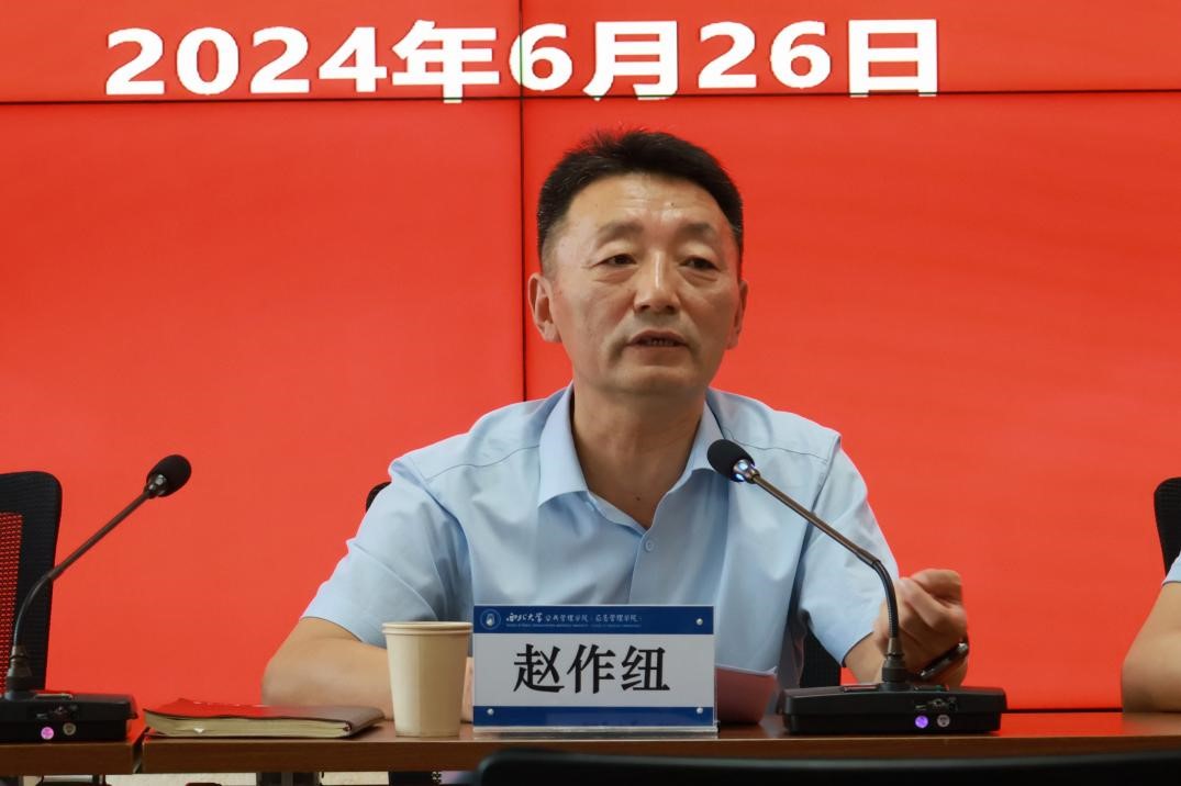 根据学校党委的统一部署,2024年6月26日,中共西北大学第十四届委员会第一轮巡察第一巡察组巡察565net必赢党委情况反馈会议召开。校党委副书记、巡察工作领导小组副组长赵作纽,校党委常委、宣传部部长、第一巡察组组长田明纲,校党委常委、统战部部长董国强,党委巡察办主任任君瑞,第一巡察组全体成员,565net必赢党政领导班子成员、党委委员、党支部书记,系主任、副高职称及以上人员、党代会和教代会代表、党外人士代表,学院工会委员、团委委员、青年教师代表、行政教辅人员代表、学生会(研究生会)主席团成员和学生代表等参加会议。会议由565net必赢党委副书记、院长雷晓康主持。