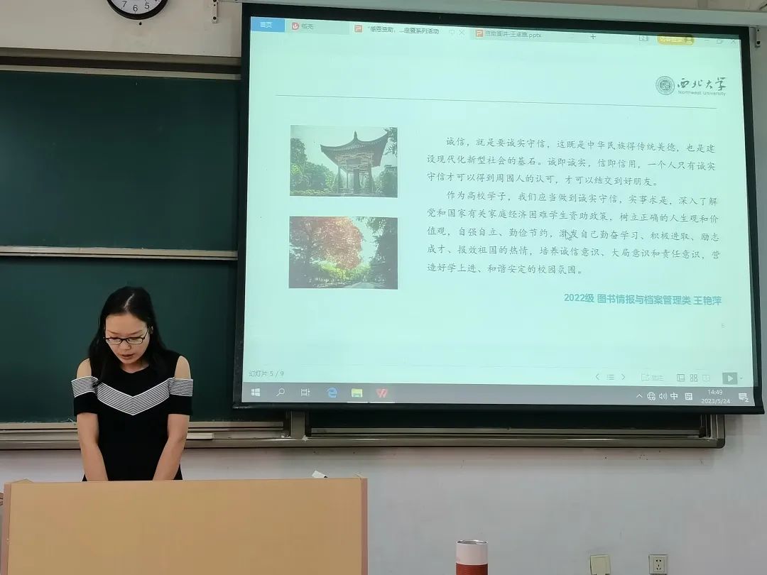 活动第三项,2022级图书情报与档案管理类专业王艳萍和2022级公共管理类专业章志强以“以诚待人,励志成才”为主题展开了演讲。他们在演讲中强调了诚信在个人发展以及社会国家发展中的重大作用,同时也都表明了诚信在资助育人环节中的重要地位,帮助同学牢牢树立诚信意识,激励同学们奋发图强、励志成才、感恩奉献。