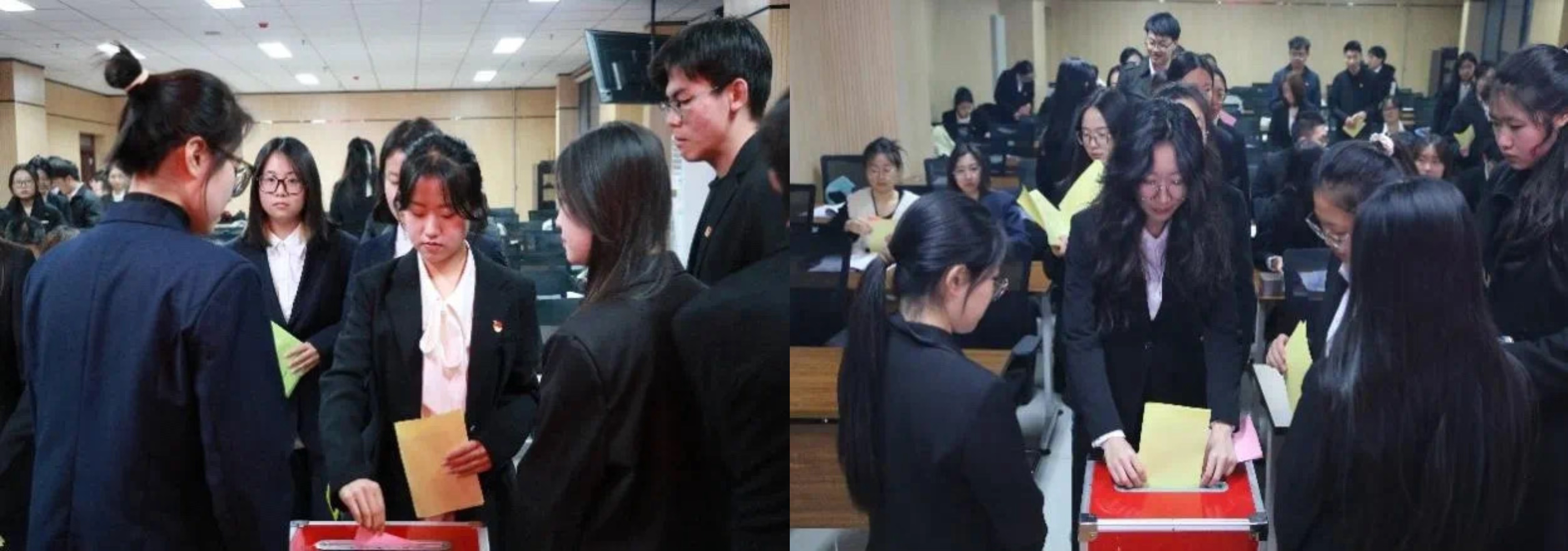 研究生会主席团成员王思齐宣读候选人简介,大会选举正式开始。各位学生代表积极参与并认真对待选举投票,依次将写好的选票放入投票箱中,由计票人员统计选票。