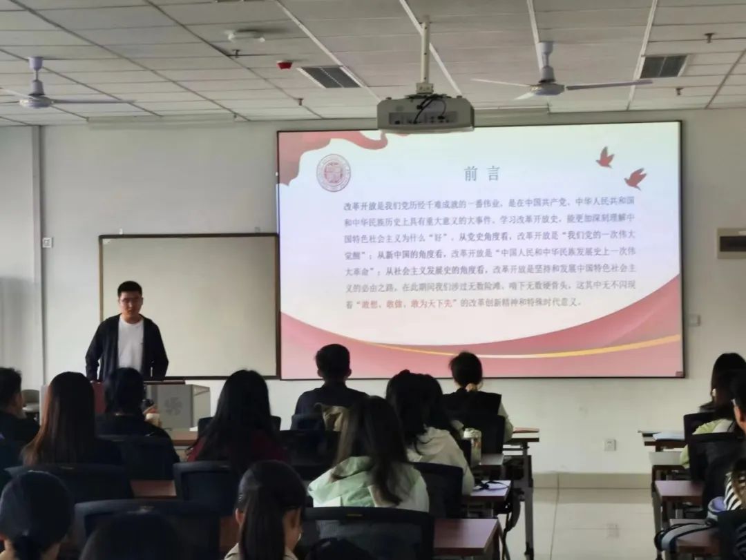 春华秋实结硕果,改革开放谱新篇。改革开放作为中国历史上的一次重大转折、中国特色社会主义道路的成功探索,学习改革开放史可以帮助支部党员更加深刻地了解我国改革开放的背景、过程和意义,理解中国特色社会主义道路的探索和发展历程,更加深刻认识到改革开放对中国和世界的影响和贡献。2023级党员赵俊超同志从改革开放的业绩与成就、改革开放成功的原因、改革开放未来思考三个方面带领大家重温改革开放史。通过他的讲述,支部党员进一步认识到中国共产党在领导中国革命、建设和改革过程中所发挥的核心作用,更加清晰地认识中国特色社会主义道路的正确性和优越性,进一步增强了对马克思主义、共产主义的信仰和对社会主义事业的信心。