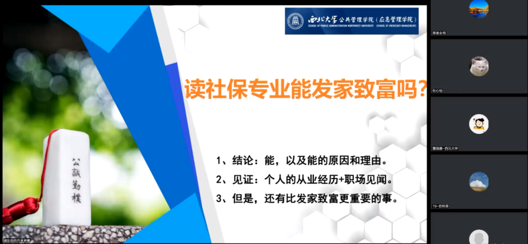 目前在西安医学院任教的余舟学长,首先为大家回忆起在他在西大求学时光中的点点滴滴,舍友间胜似手足兄弟情和感人的师生情如画面般为听众们一一呈现,他满怀深情地感谢西大社保专业给予他宝贵的精神财富,给了他从事各种工作、面对各种挑战最大的底气!接下来余舟学长又结合自己多年来,丰富的管理工作经验,解答了社保系在校生们在就业方面的困惑,提醒同学们管理需要与具体专业领域相结合,管理者需要丰富的知识储备,就业方向上不应自我设限,边做边学是管理工作的常态。其丰富的工作经历和感悟让在校生们深受启发。