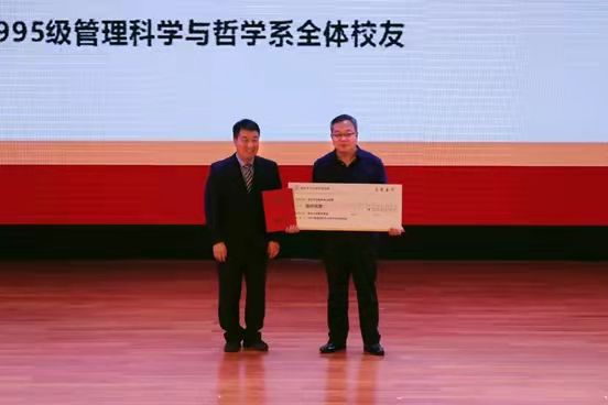 (图为:西北大学565net必赢成立二十周年庆典中“校友向母校捐赠仪式”——1995级管理科学与哲学系全体校友向母校捐款)