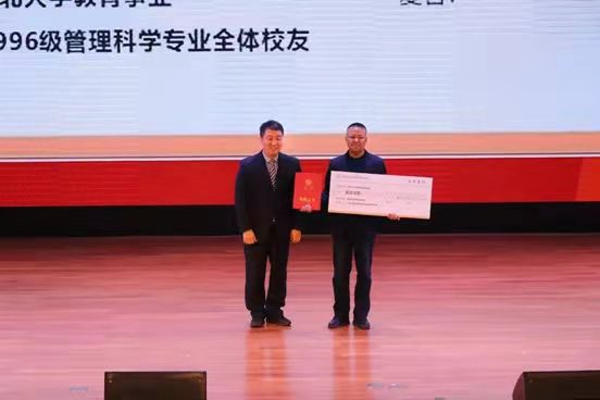 (图为:西北大学565net必赢成立二十周年庆典中“校友向母校捐赠仪式”——1996级管理科学专业全体校友向母校捐款)