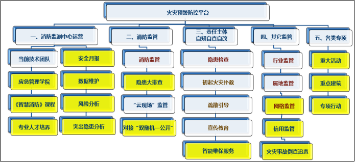 消防安全监管平台,对接消防大脑,将传统拉网式监管转变为基于消防大脑的精准监管,通过智能操作提高“双随机˙一公开”、行业、属地、网格监管和责任主体“自知自查自改”的效率,对于各消防安全重点单位,监管平台可以按消防大脑的提示自主消除和排查隐患。对于有条件的地区可以结合当地高校应急管理相关的专业共建消防监测服务中心。