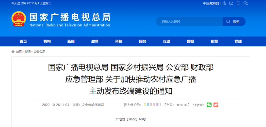 《中共中央 国务院关于做好2022年全面推进乡村振兴重点工作的意见》(中发﹝2022﹞1号)提出要统筹推进农村应急管理与治理资源整合,加快推进农村应急广播主动发布终端建设,指导做好人员紧急转移避险工作。应急广播是国家政策宣传、应急管理、社会治理和精神文明建设的重要基础设施,是打通信息发布“最后一公里”、实现精准动员的重要渠道,也是创新性开展农村精神文明建设的有效传播途径。为了贯彻落实中央文件精神,做好农村应急广播主动发布终端建设和管理工作,现将有关要求通知如下:
