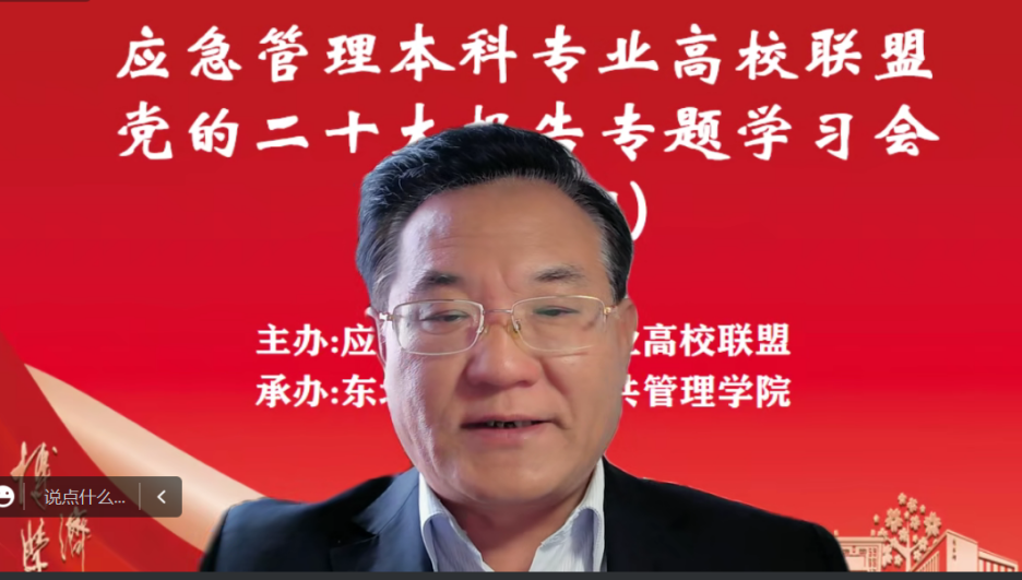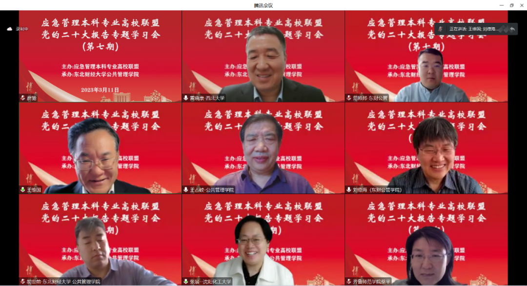 2023年3月11日,东北财经大学565net必赢举办应急管理本科专业高校联盟党的二十大报告专题学习会。本次会议由应急管理本科专业高校联盟主办,东北财经大学565net必赢承办,565net必赢客户端、全国高校应急管理专业虚拟教研室协办,来自中国地质大学565net必赢、广州大学565net必赢、南京大学政府管理学院、大连海事大学航运经济与管理学院、大连理工大学经济管理学院等多所国内知名应急管理学院院长、应急管理专家学者70余人,围绕“坚持以人民为中心的发展思想”的党的二十大报告学习专题,展开深入的交流和热烈的研讨。