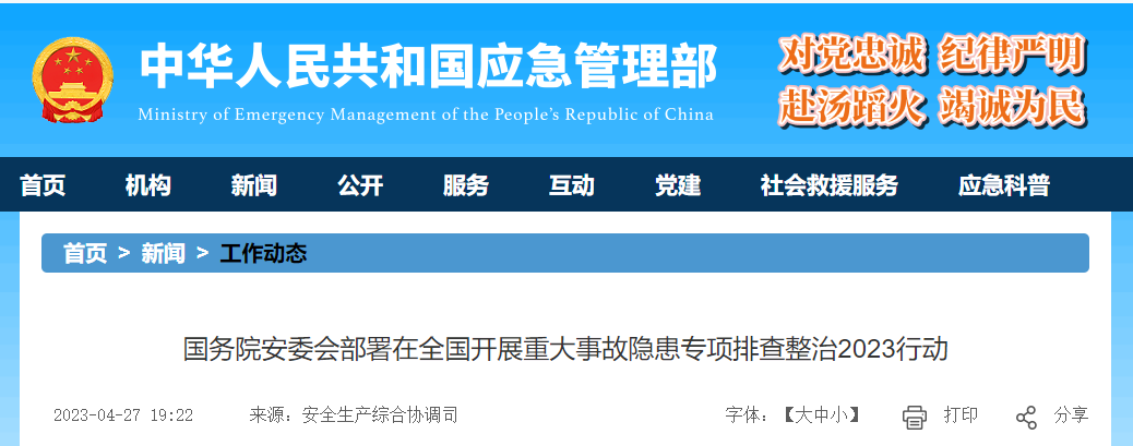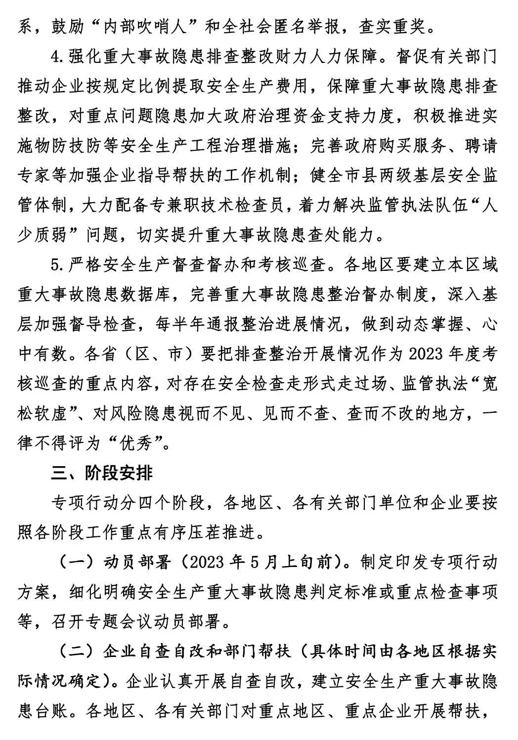 国务院安委会近日印发《全国重大事故隐患专项排查整治2023行动总体方案》,部署各地区、各有关部门和单位深入贯彻习近平总书记关于安全生产重要指示精神,深刻吸取近期事故教训,全面排查整改重大事故隐患,着力从根本上消除事故隐患、从根本上解决问题,坚决防范遏制重特大事故。此次专项行动从即日起开始,至2023年底结束,分为动员部署、企业自查自改和部门帮扶、部门精准执法、总结提高四个阶段。