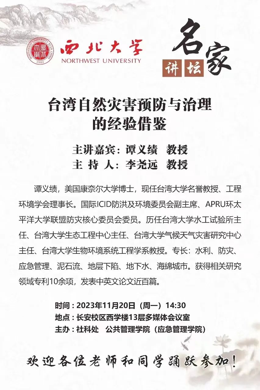 2023年11月20日下午,台湾大学谭义绩教授受邀做客我校“名家讲坛”,作题为《台湾自然灾害预防与治理的经验借鉴》的学术报告。本次报告会由副院长李尧远教授主持,我院教师代表以及研究生、本科生到场参会。