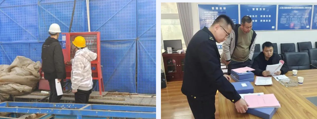 接着,检查组穿戴好防护装置,来到项目工地,对特种设备定期检验表、脚手架塔设符合标志、机械设备完好情况、电气设备漏电保护器安装、安全生产现场记录等仔细检查问询。