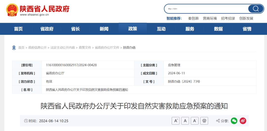 应急政策 | 陕西省人民政府办公厅关于印发自然灾害救助应急预案的通知