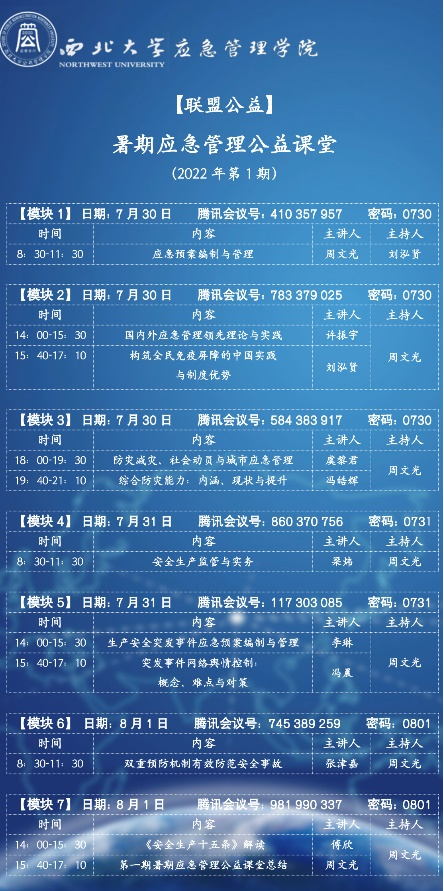 2022年7月30日至8月1日,2022年第一期暑期应急管理公益课堂在线举行,此次暑期应急管理公益课堂是全国应急管理本科高校联盟公益活动的重要组成部分,活动由西北大学应急管理团队师生主讲。来自全国各地的应急管理专业学生、教师和实践从业者参与了系列课程,累计服务960多人次。
