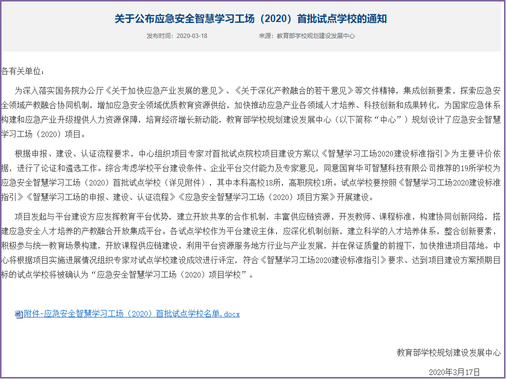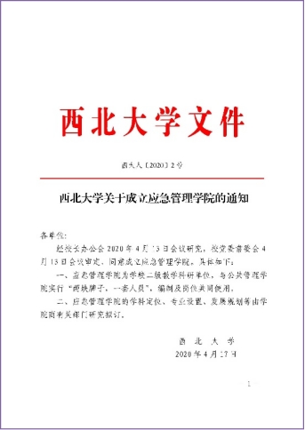 2020年3月17日,教育部学校规划建设发展中心公布2020年首批应急安全智慧学习工场暨应急管理学院建设名单,西北大学成为首批试点学校。2020年4月17日,西北大学发文成立西北大学应急管理学院(西大人[2020]2号),挂靠565net必赢。2020年6月10日,西北大学举行应急管理学院揭牌仪式。2020年9月,西北大学在公共管理一级学科下设应急管理硕士、博士培养方向,2021年3月,应急管理本科专业(理科招生)获批,进而形成了“本-硕-博”完整的应急管理人才培养体系。