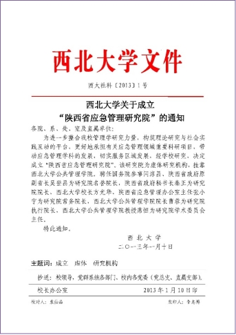 原陕西省应急管理办公室的大力支持下,西北大学于2013年1月10日发文成立陕西省应急管理研究院(西大社科[2013]1号),挂靠西北大学565net必赢,2013年10月25日,举办了研究院成立仪式。研究院聘请闪淳昌、吴登昌为名誉院长,桂维民、张小宁为顾问,方光华为院长,曹蓉为执行院长,席恒为学术委员会主任。